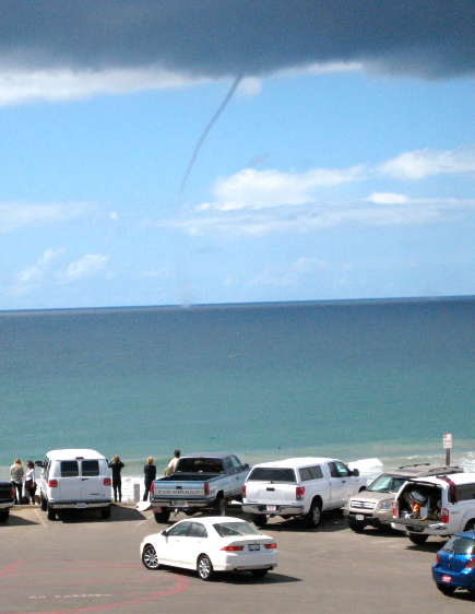 horizon of Encinitas were billowing puffy clouds; California showing off, as usual. But as we crested the hill we noticed several cone shapes in the cloudbank over the ocean, pointing down!… Some were spear shaped and looked like tornadoes. Not the norm for San Diego – or California for that matter. I’ve lived on this coast nearly all my life and have never seen anything like this…one rogue funnel cloud perhaps – but seven in a line up? Never. Who says there is no climate change?