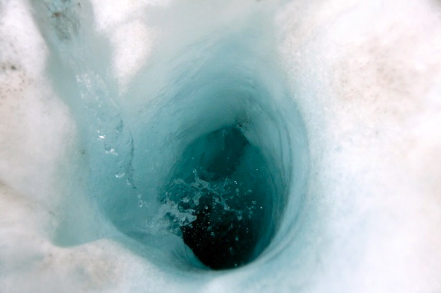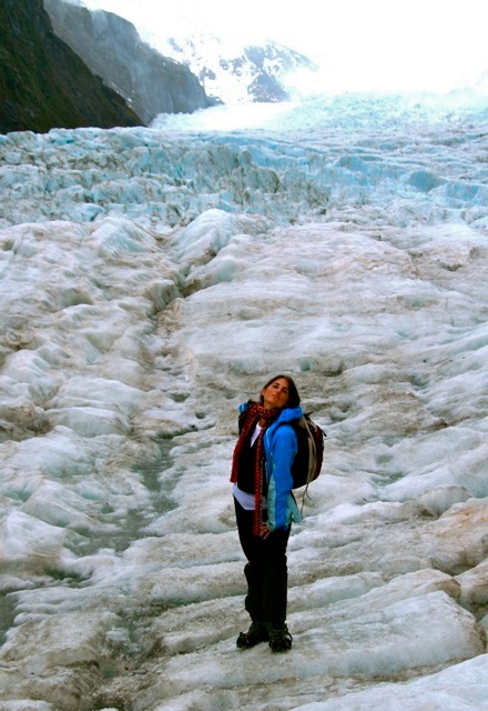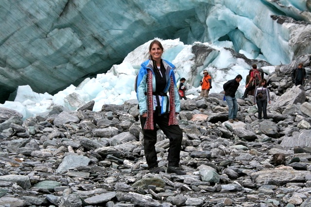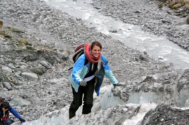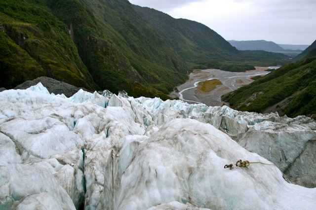 One time, Ryan let us step down a few feet into a narrow ice cavern for photo ops, and I went down there for my “moment”..and my cash popped out of my pocket. I bent to retrieve it and my boot shoved a mound of loose ice chunks ahead of me – carrying the bills – further into the crevasse. I laughed and stepped gently deeper again…and shoved it further. Not laughing as much now – thinking about the film “Touching the Void”…with my fellow climbers looking on…I tried one more time, stepping ever deeper down, and voila! Got my NZ $15! The group exhaled. They didn’t want a retrieval operation! Haha.