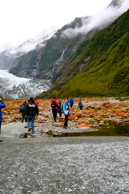 We were shuttled to the car park at the river valley below the glacier. We started out, propelled by our excitement, each of us assigned our talons (a type of crampons specifically designed for glaciers) and carrying them in fanny packs. We stopped and gazeded ahead at the base of Franz. It appeared to be no more than a 5-10 minute leisurely stroll away. But the immense size can deceive…it was still 30-40 minutes away at a good clip. At the base, we stopped and strapped on our talons…the excitement building even more.