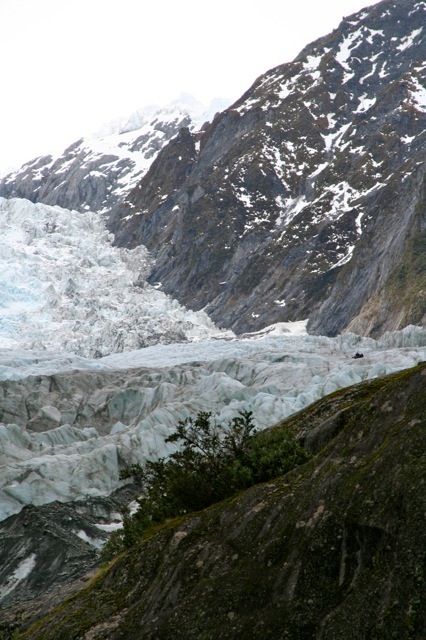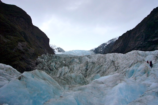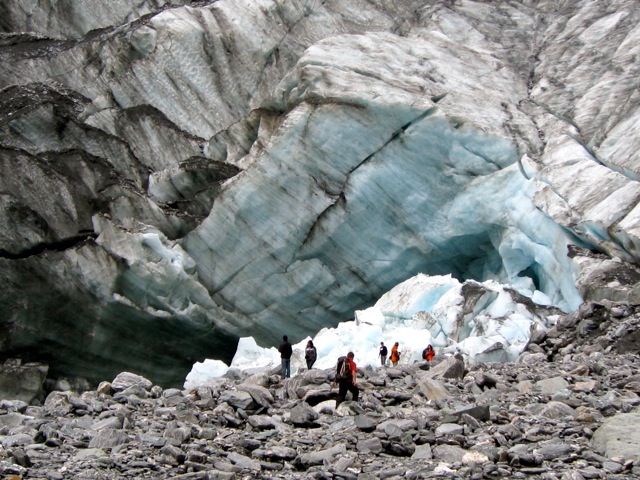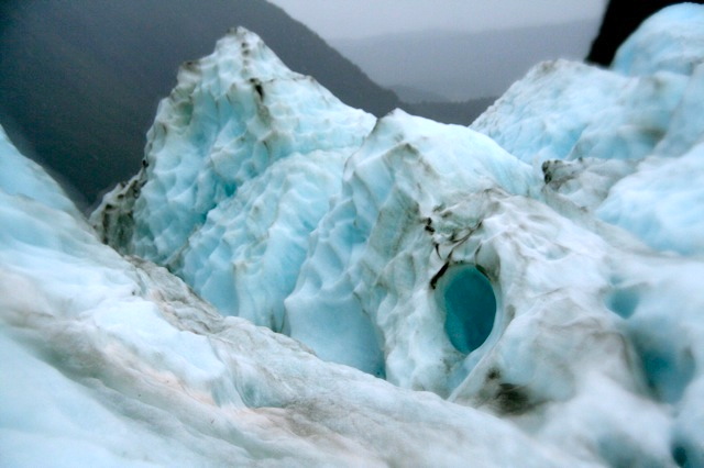 Some stats on Franz-y: It is a rare glacial region indeed, where the ice pack meanders down at 45 degree angles from the Southern Alps directly down into a temperate rain forest. In this area, they receive 30 METERS of snow a year. We think in feet – and usually not 30 – in our local mountains! At it’s fastest moving point, Sir Joseph moves at 5-6 meters per DAY! It is not recommended to hike in these areas, for good reason. In the lower regions, the “dirty” area you see is not the result of constant tramping by hikers. It’s churned up shale from the river valley below, and as the ice shifts and makes its’ way down, it carries and pushes it ahead. Up higher, we encounter more pristine white and deep blue ice.