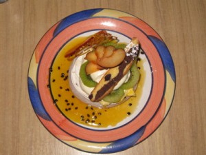 And finally, after a familiar food quest…but this one for the famous Pavlova, of which we had much anticipated and sought, we had the good fortune of finding the most beautiful (and quite delectable) desserts I had ever had laid in front of me. It is a kiwi creation of merengue, passion fruit sauce, kiwi and plums. Wow! Thank goodness we are trekking!