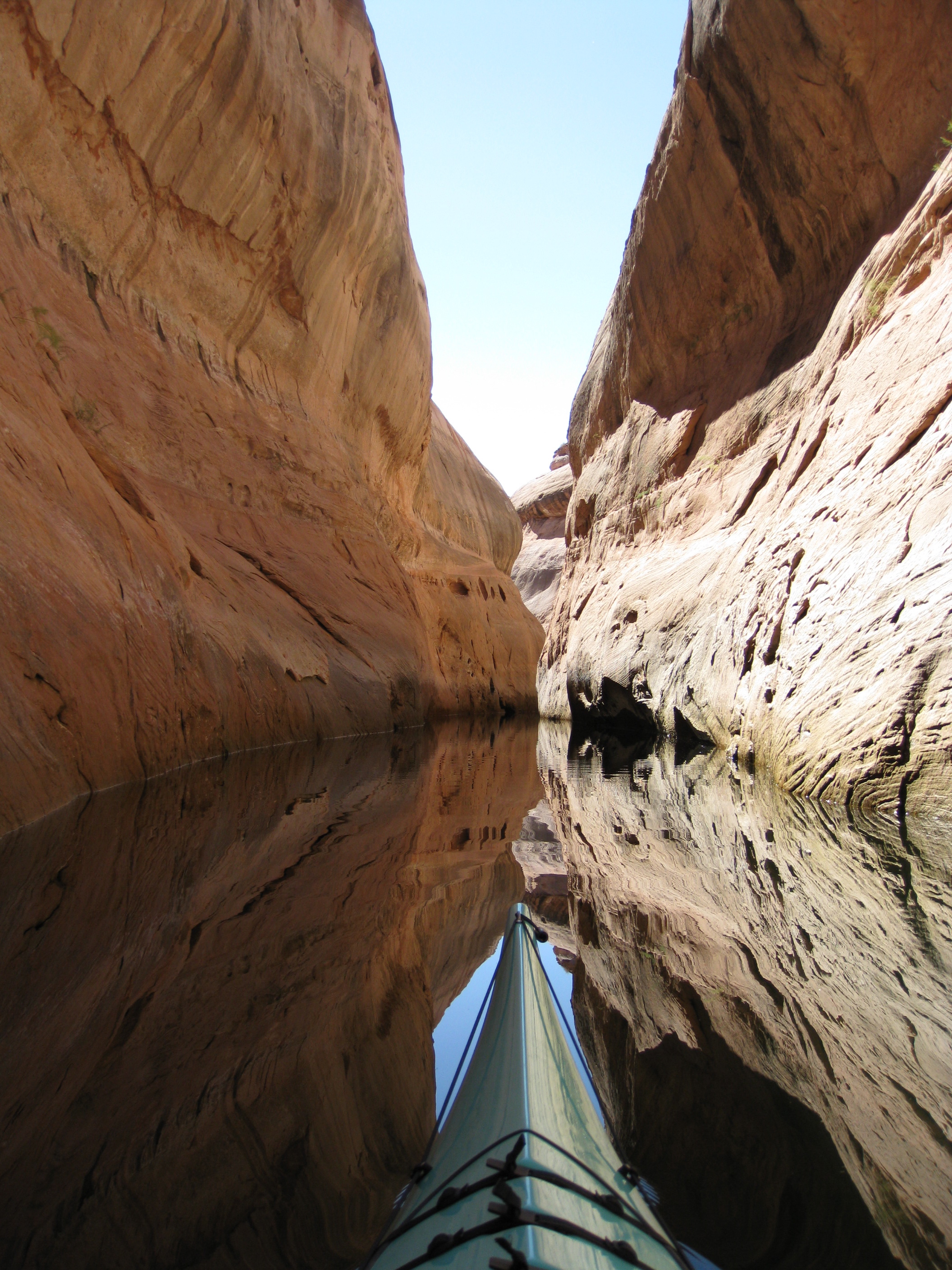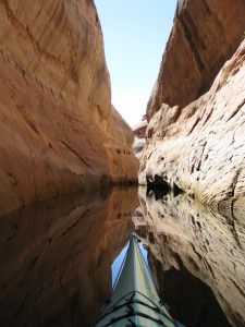I’m liking this ritual of a morning kayak through our neighborhood. This time, we go exploring and venture deep into narrowww canyons… we actually abandon my posh Solstice kayak and tuck it away in a dark watery dead end, to protect its’ girly figure, and proceed to force the plastic boats through progressively narrowing gaps filled with deep water (which swallowed up my fancy Sig water bottle, derned nammit!) until we could proceed no more. The minnows who take refuge in these cracks, rather than canyons, were literally leaping up the sides of the rock, out of the water to flee the behemoth monsters booming and echoing their charge through their terrain. The views and light and shadow in these always changing hallways of crimson rock were mesmerizing… I kept fishing my camera out of its safe haven in ziplockville to snap shots against the backdrop of my companions’ voices urging, “Gina, moooove!” My favorite accomplishment of the day was switching from my sit-inside kayak, balancing precariously mid channel, to Jacks sit on top, then vice versa, successfully…thereby depriving my friends – who were poised with all sorts of camera and video equipment – of an entertaining dump in the cold water. Paddling back, we stopped for a little granola bar break at a little beach nestled in a cove. We looked like a commercial for the Arizona Tourism Board.