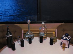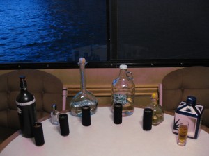 Friday – After an “interesting” night being assaulted by the mattress cushion we had positioned to provide a windbreak for me, we enjoyed some delicious cawfeee and Gretchen once again set to the task of wowing us and obese-ing us with her peak-to-peak pancakes with copious amounts of lemon juice and powdered sugar slathered into a sweet icing… mmm. We hopped into Play Toy and braved the white caps to venture over to Dry Rock Creek for a brief but lovely hike. We then head out to the main channel for cell service. The ridiculous adventuress in me insisted on sitting in the bow for an extra bouncing jolting Mr Toads’ Wild Ride 🙂 I must be getting old… I was laughing hysterically all the while a usually-suppressed voice of self-preservation was telling me this MAY not be good for my body to be lurched so violently. But hey, it was fun! Meanwhile, back at the boat, Gretchen had started in on yet another tantalizing meal of chilled sesame pasta with shrimp and lime, along with a jicama slaw. But FIRST, tequila tasting 🙂 I found two such agave extractions to be actually somewhat palatable… and I started quite the nice buzz. Excuse me, I must now break for coffee ice cream…. to be continued…OK, Im back. Now I have a pineapple juice with malibu rum. I must counteract the effects of the caffeine in the ice cream, of course.