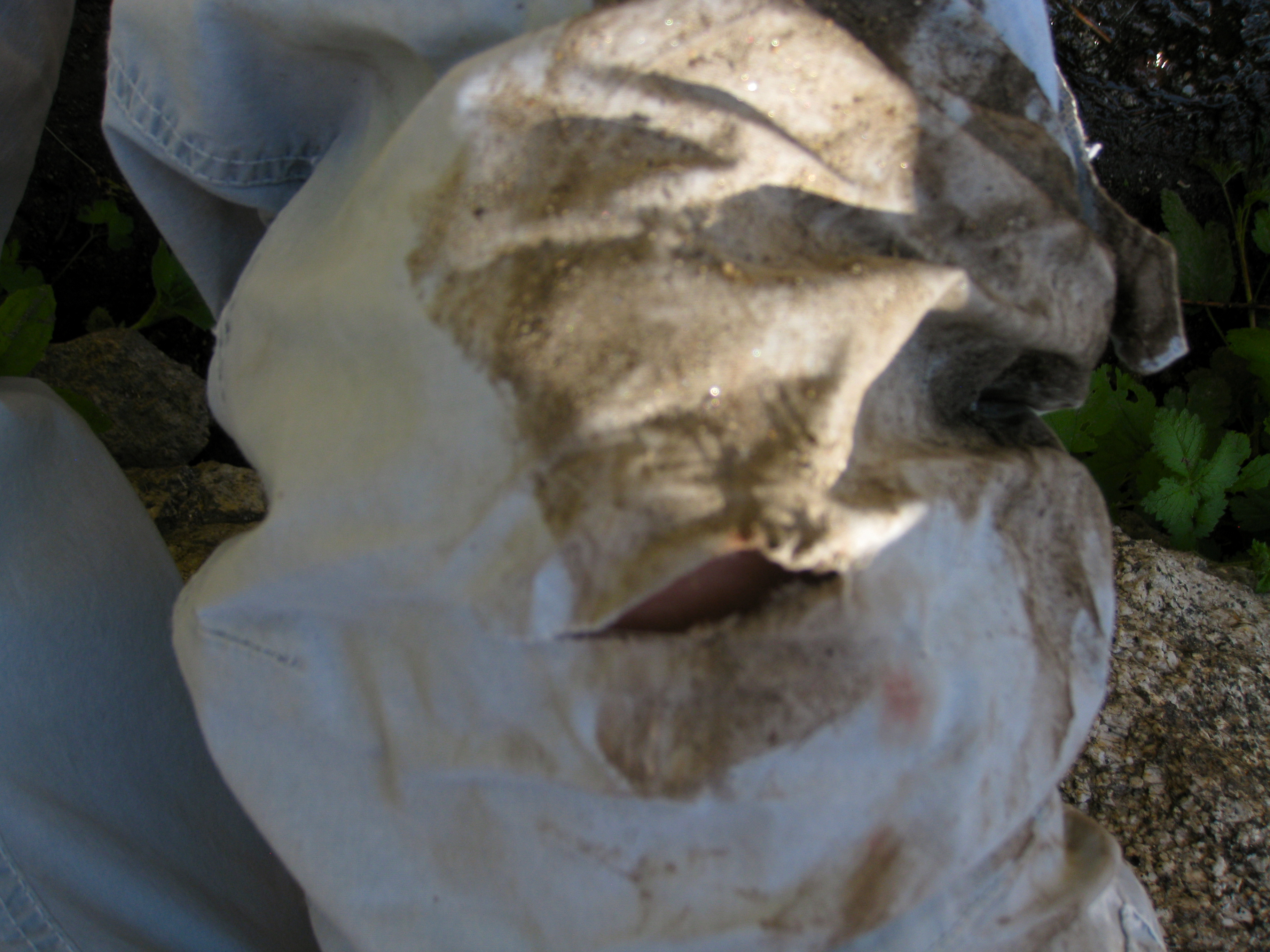 We donned our packs and headed out, feeling invigorated and as strong as when we started.  We had 4.5 miles to get back, making a nine mile trek and we began talking more seriously about planning and tackling longer, more challenging hikes to the peaks in our ‘hood.  In fact, when we had two more miles to get down, I was remarking how strong and fit I felt after a pretty strenuous hike and I swear I had a spring in my ste – whoops!  I slipped off a wet rock and rather than help me stabilize, my trekking poles seemed to get tangled and I went down HARD – ripping my really cute hiking pants! – as well as a hole in my knee and ankle and jarring my pinky, which was caught in the poles. I was laying there in the mud of a small stream trying not to cuss – or rather not verbalizing the profanity that was running through my head – and tapped the floor in a silly attempt to chase the pain away…like shooing away bad spirits!
