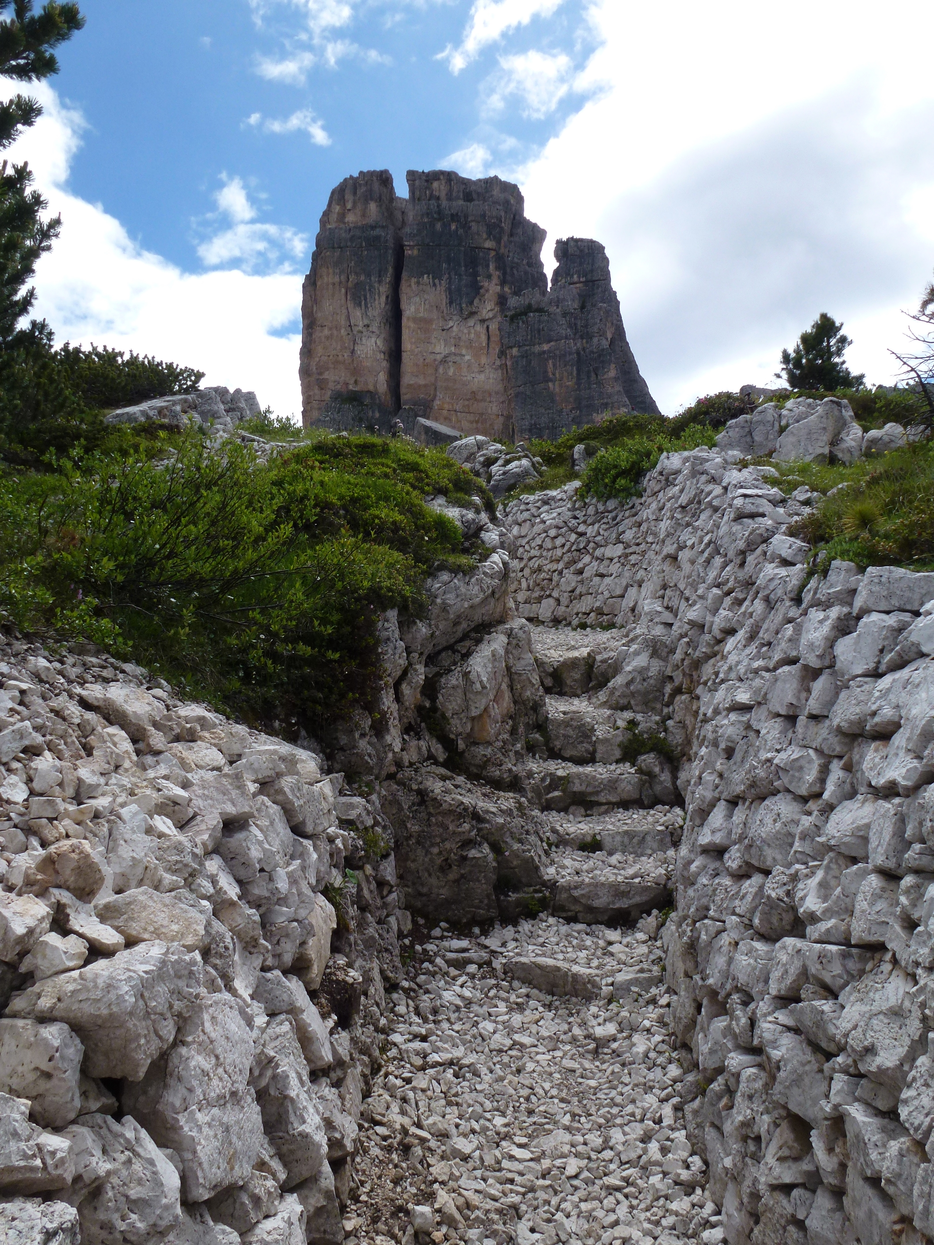 For the afternoon, we made our way up different routes to another beautifully situated rifugio, and Gary guided most of the group through a fascinating outdoor museum of World War I trenches, stone walls and fortifications along a ruggedly beautiful walking path. In some cases, manikins are installed to illustrate the conditions and warfare experienced by the soldiers embattled in defending or besieging the critical Dolomites region during the war.